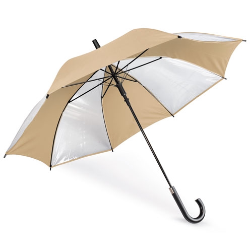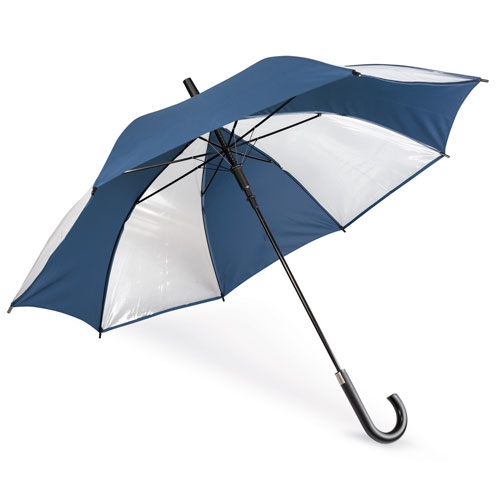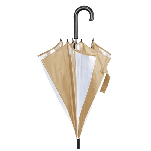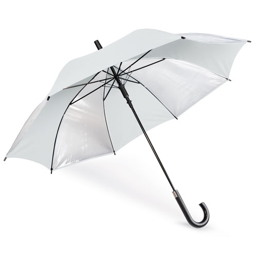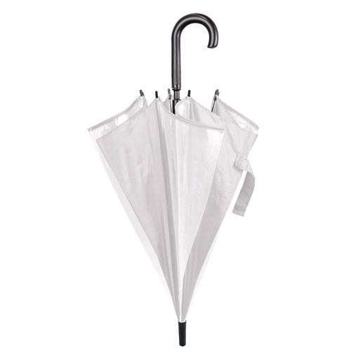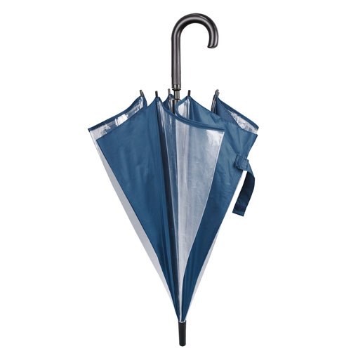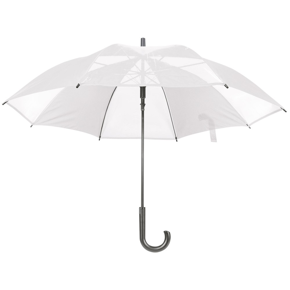 Paraguas de 8 paneles transparentes combinados con colores opacos, estructura y varillas metálicas. Apertura automática con pulsador integrado en un elegante mango negro.