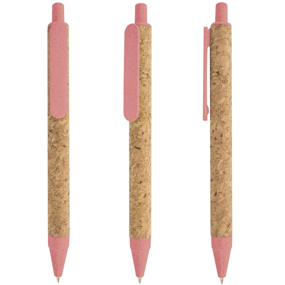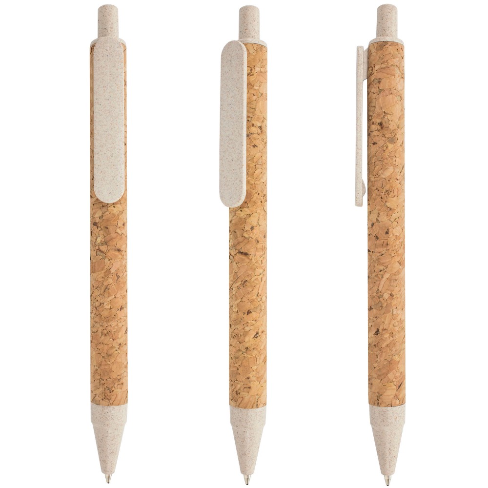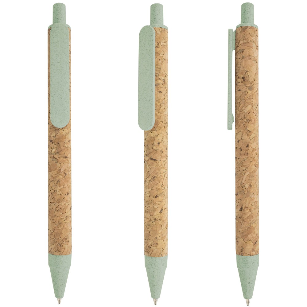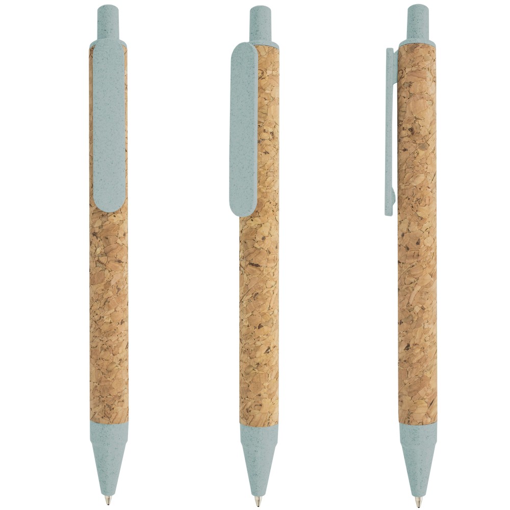 Bolígrafo con cuerpo fabricado en corcho y terminaciones con fibra de trigo ecologico, respetuoso con el medio ambiente.