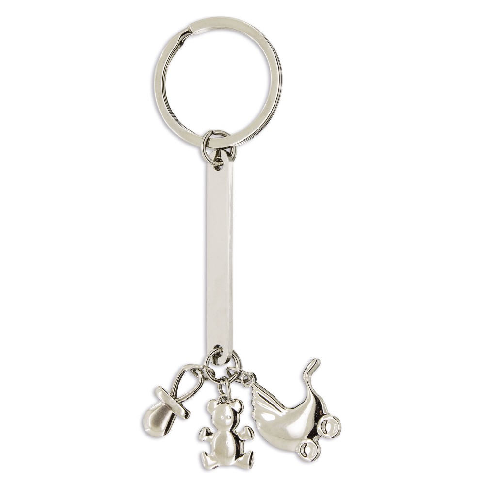 Llavero con tres abalorios especial para bautizos. Fabricado en metal.