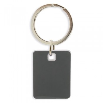Llavero con diseño cuadrado. Su estructura consta de 3 partes: dos láminas de aleación de titanio, y una de plástico entre ambas.