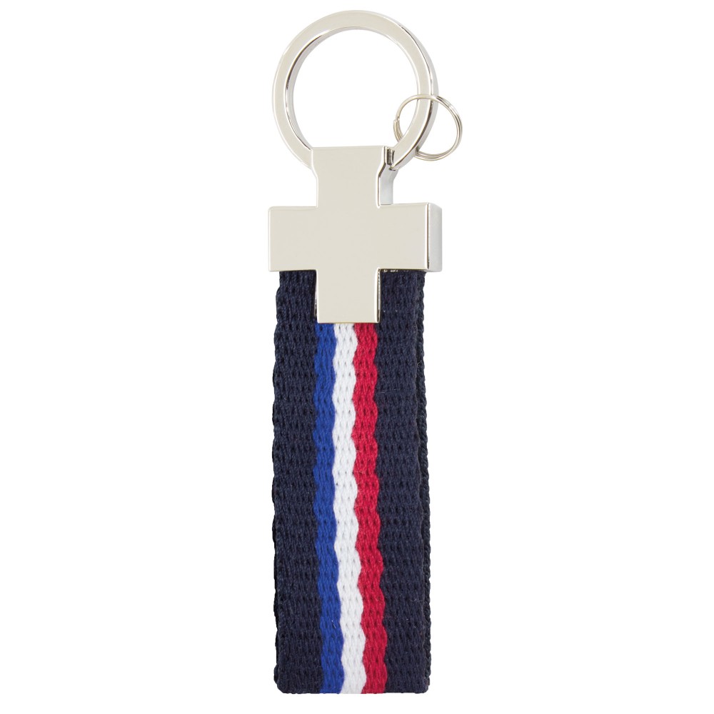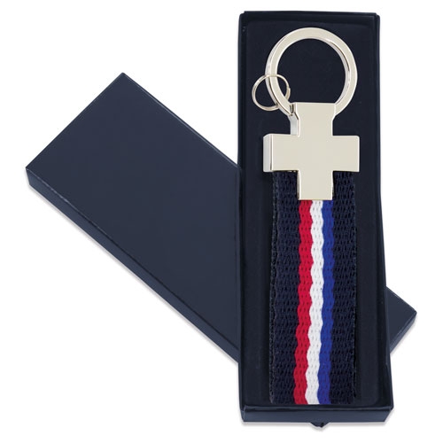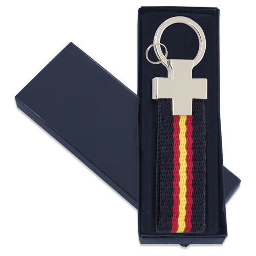 Llavero de matal niquelado y poliéster, con detalles de bandera de España, Francia e Italia.