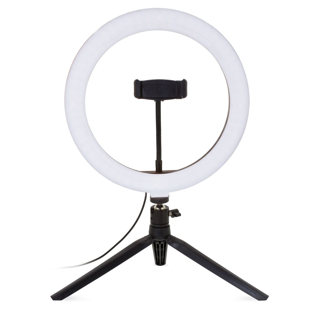 Práctico trípode con aro de luz incorporado para iluminar tu rostro de manera profesional. Intensidad regulable en sus 3 modos de luz (cálida, fría y mixta)