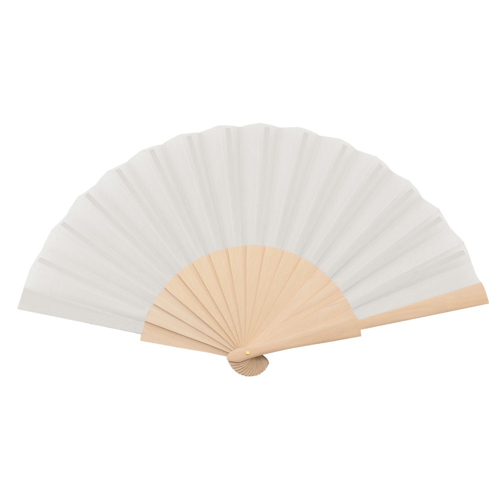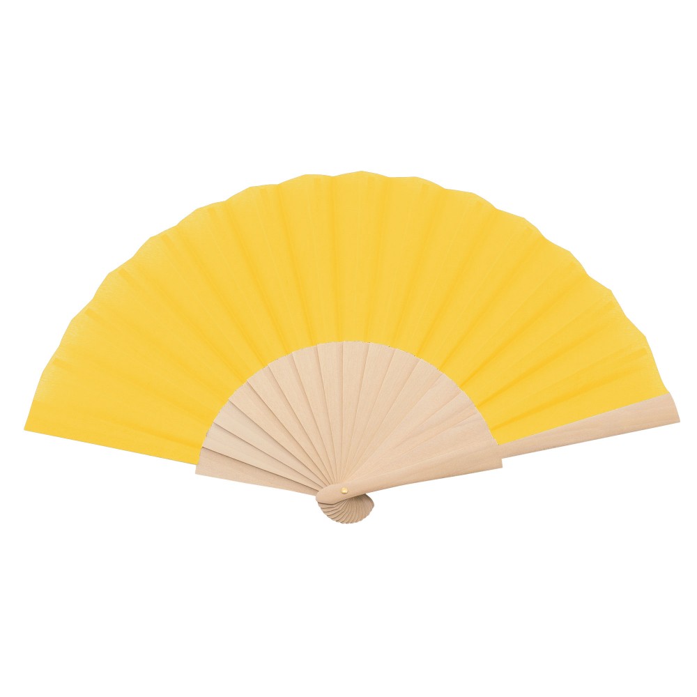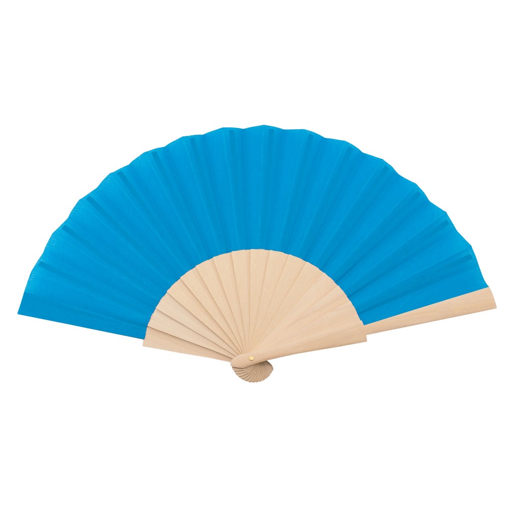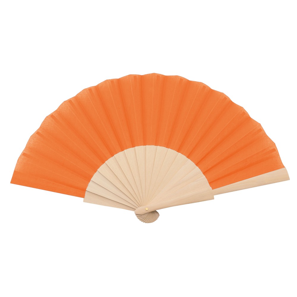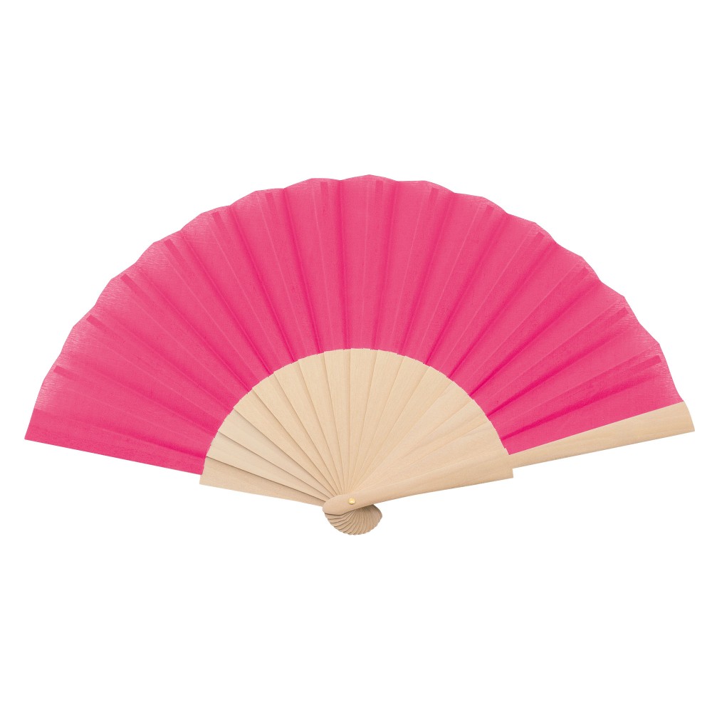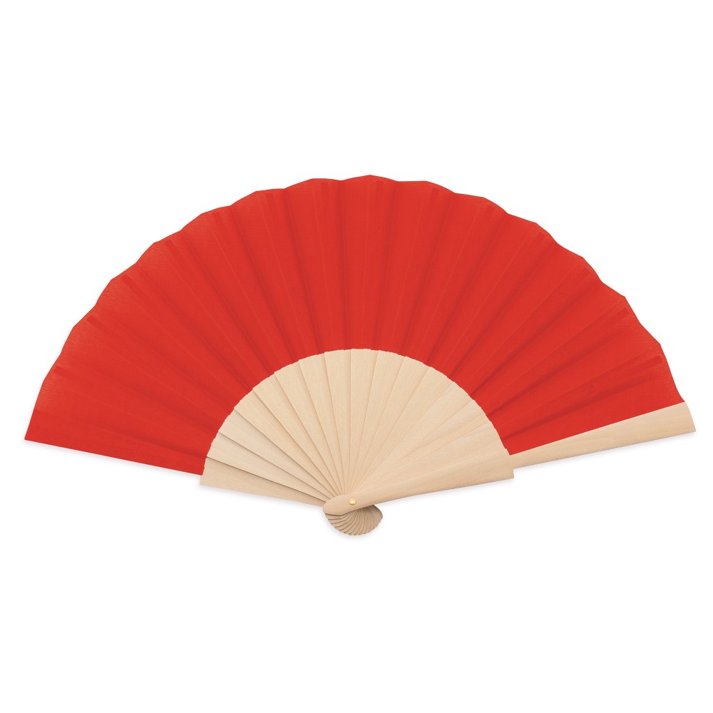 Abanico con varilla de madera y tejido en poliéster.