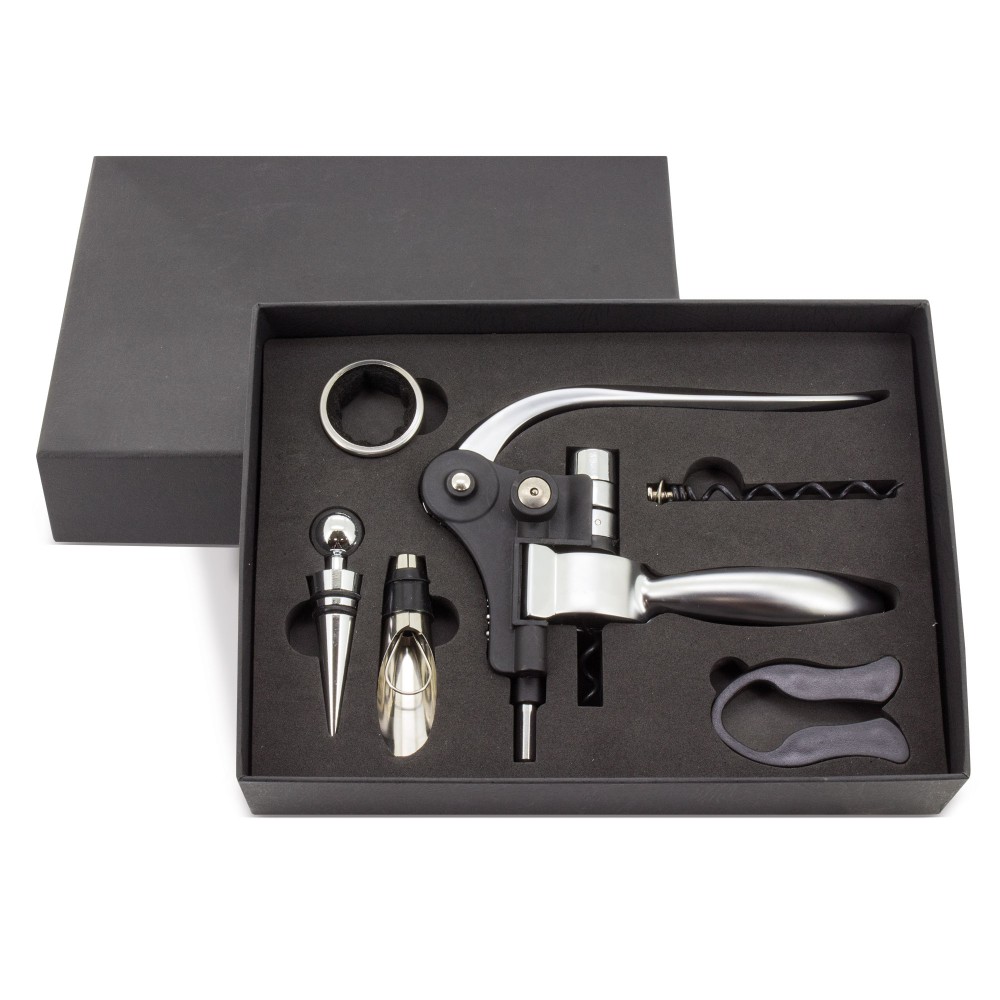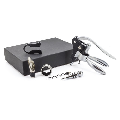 Estuche con abridor de palanca, anillo antigoteo, tapón de vacío, descapsulador y dosificador.