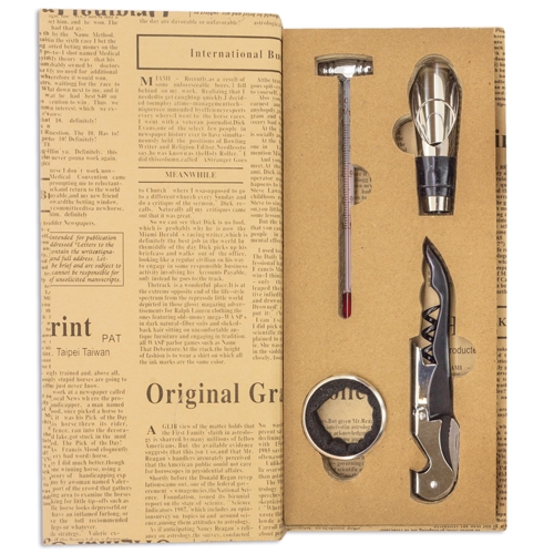 Estuche fabricado en cartón reciclado, con anillo anti goteo, dosificador, sacacorchos y un termómetro.